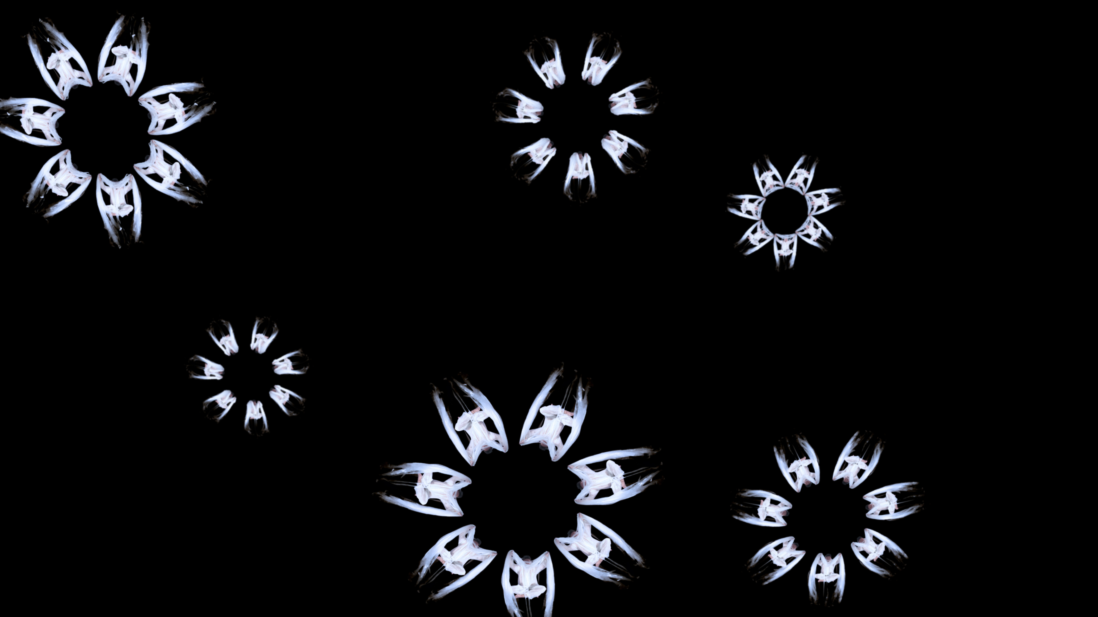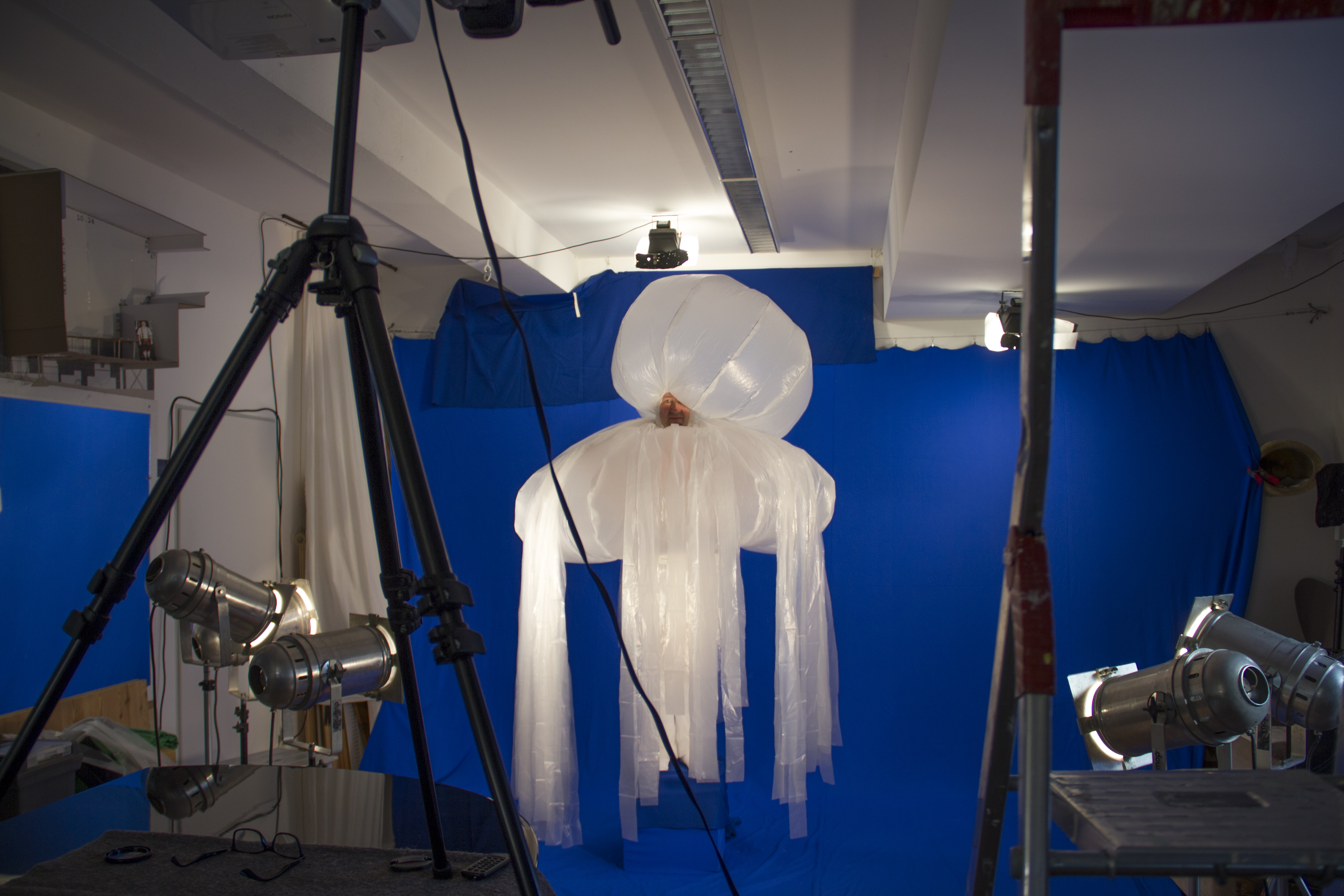 This project was initiated the Wacoal Art Center in Yokohama (Japan) for the water projection on the water curtain at the "Fountain Plaza" in Gwangju, South Korea. The idea of a dive through a coral reef was created. A forward movement into the darkness, where creatures appear again and again from the depths. From this idea, individual costumes and creations of water creatures were created, such as small jellyfish, large medusae, squid, small and large whirls, which consist only of flagellar arms. These move through the space and draw the viewer into the picture.
