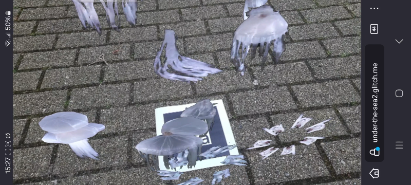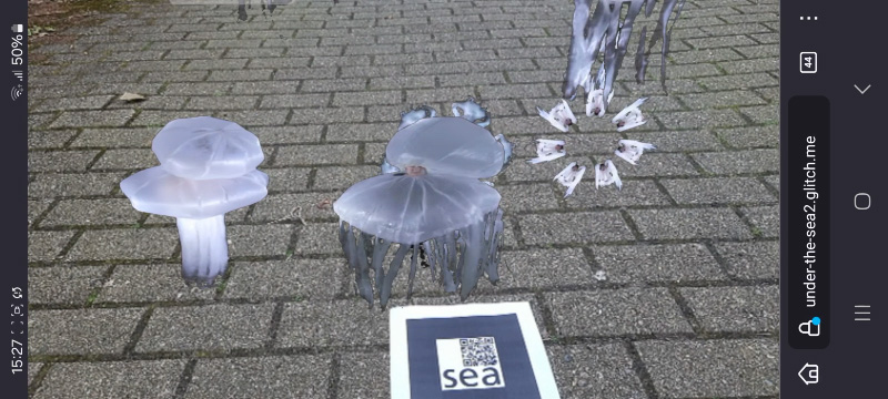 You take your mobile phone and scan the QR Code with your camera. The browser pops up and suddenly small ocean creatures are swimming on the pavement, struggling to keep on with the current.